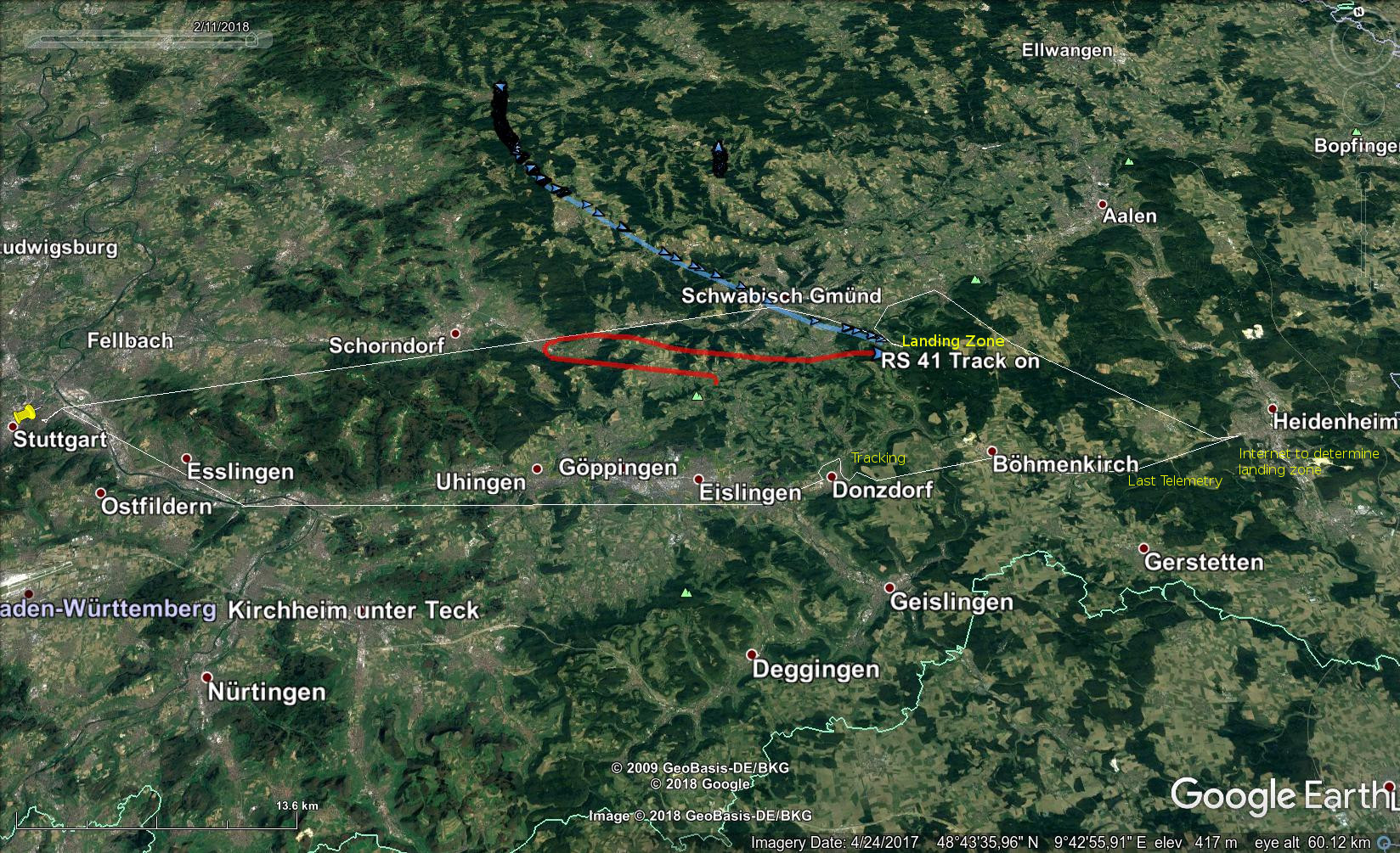 The dominating inversion in and around Stuttgart had reduced the wind speed over the last couple of days so that the weather probes launched in Stuttgart would also come down close by. On the weekend, the wind had freshened up. The prediction for Sunday still looked promising, and placed the landing zone near Geislingen which is about 50 km South East of Stuttgart near the autobahn A8.