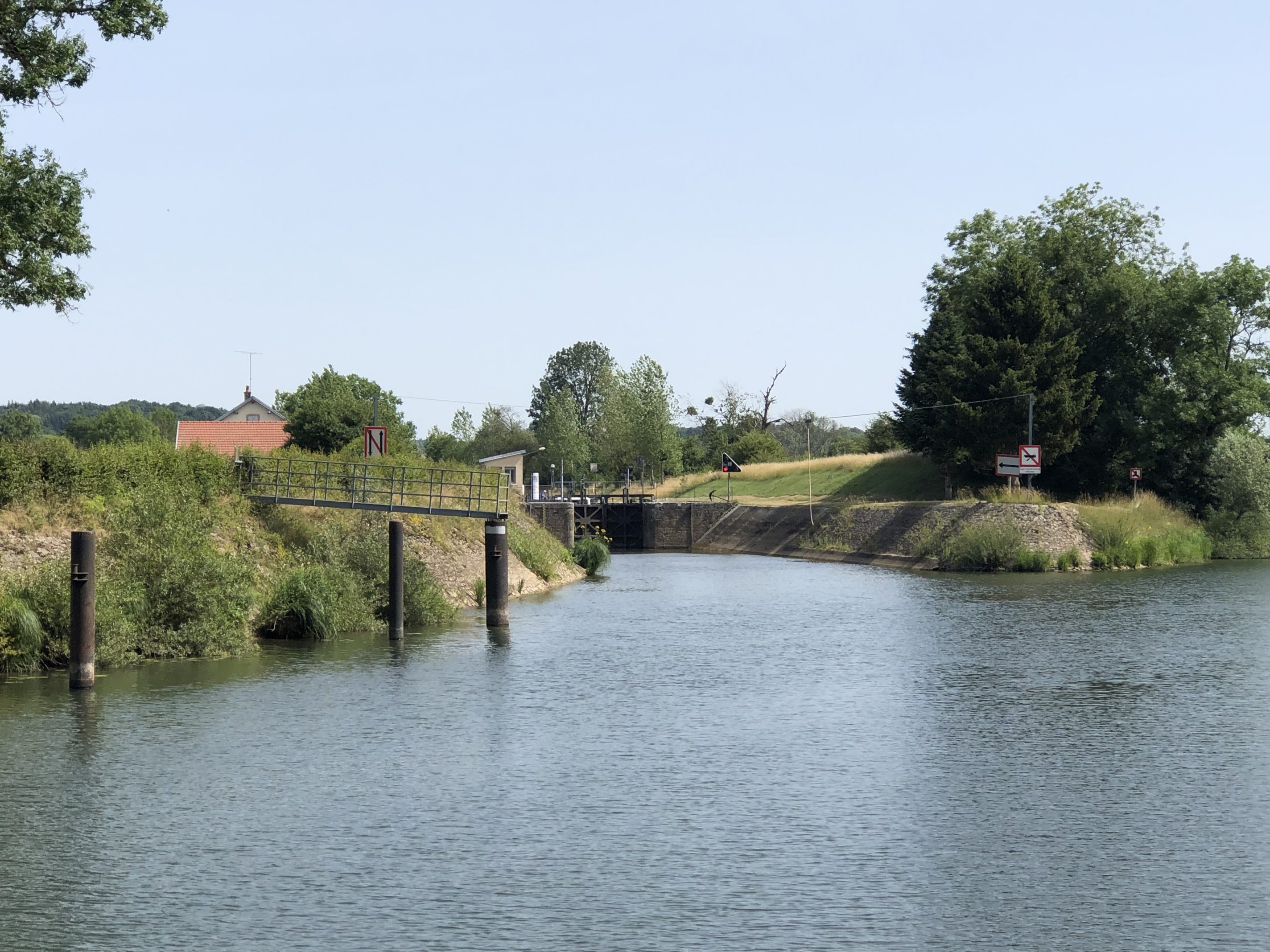 The boat tethered to our mooring site en sauvage. (GPS coordinates are 47.581306, 5.857806)We are leaving our camp siteA canal near the barrage of SoingTrees, fields, hay bales, and the village of Fédry in the distance — a very pleasant view gently passing byA lone tree on the river bankAuxiliary Lock – Écluse de garde near Cubry-les-SoingLock #9 — Écluse de Chantes Lock #9 — Éclusede Chantes — downstreamLock #9 — Éclusede Chantes — upstreamPont de ChantesChâteau de Rupt-sur-SaôneLock #8 — Écluse de Rupt sur Saone. It leads to tunnel. We had no time to explore it. Should we be in the area again will surely pay it a visit.The Saone.An unregulated part of the river — nowadays a sidearm.The shoreline seems no longer be fortified. Trees are obstructing our way. We are making our way through a jungle.The bridge of Trave aheadA sandbank. Luckily well marked for the unsuspecting river boat captain. A heron is looking for fish.Shallow water aheadSign leading to the bayNoonish. It is hot. There are no waves nor wind. The scene is relaxed and quiet. Even idyllic to some degree. The people in the boat in front of us are sitting on the deck and are having a long lunch. Roundel in Trave with a Christian symbol in the middle and a church in the backTheTempête de Joie safely tied to the jettyBridge of Trave in shallow water near its pillars. Caution required.Trees in the water and the tow paths are no longer visible. Nature has partially claimed back the river.Leg of the seventh day.
